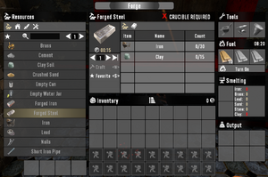 A Forge is used to smelt items into refined products that are more useful. This process requires time, fuel sources to operate, and scrapped or whole materials to smelt.